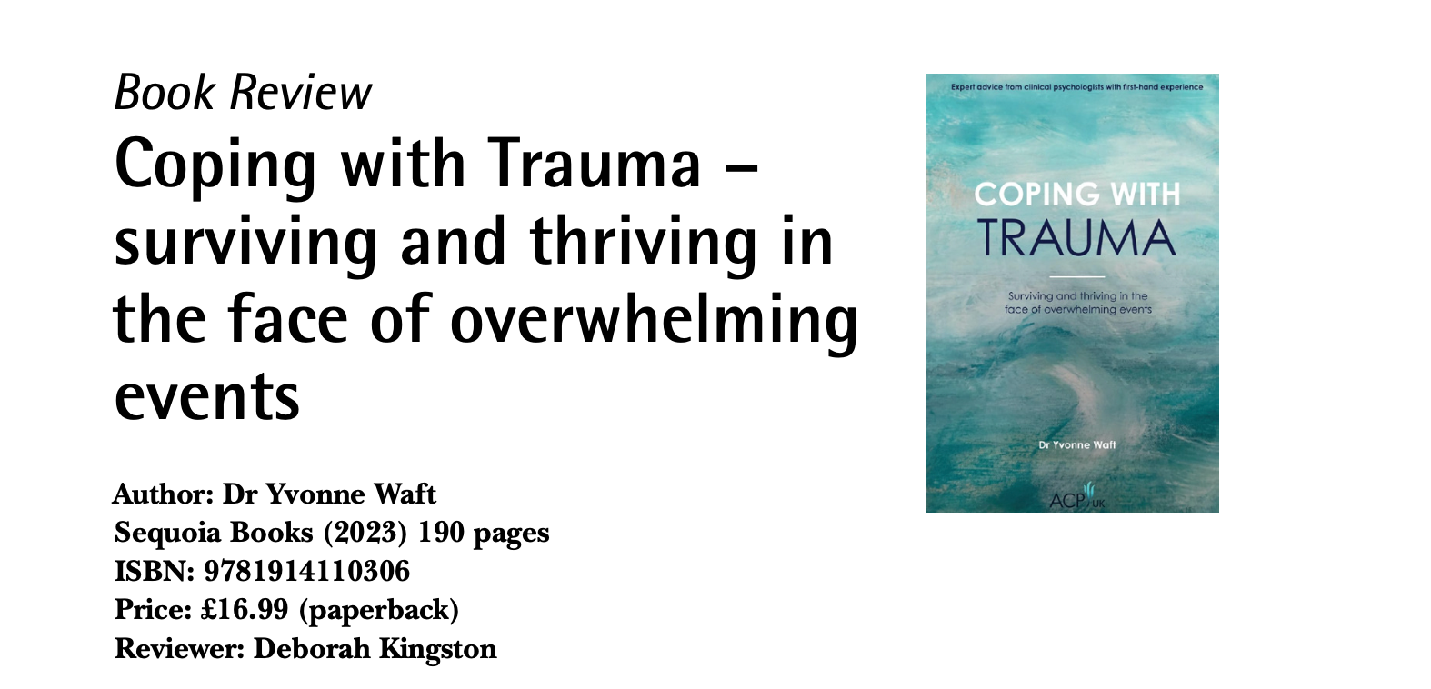 This is a pre-publication version of the following article: Kingston D (2025). Book Review: Coping with Trauma: Surviving and thriving in the face of overwhelming events.Psychology Teaching Review Vol. 31, No. 2, pp127-128